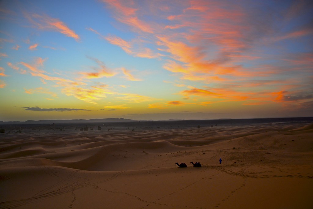 Wake up to a mesmerizing sunrise over the dunes, a moment of tranquility and awe. Spend the day exploring the Sahara, riding camels, visiting nomadic villages, and discovering hidden desert oases. Learn about the Berber way of life, explore fossil-rich areas, and enjoy the peaceful, expansive desert landscapes. The evening is spent back in the desert camp, sharing traditional Moroccan dishes and listening to the melodies of local music while the desert sky unfolds in a tapestry of stars.